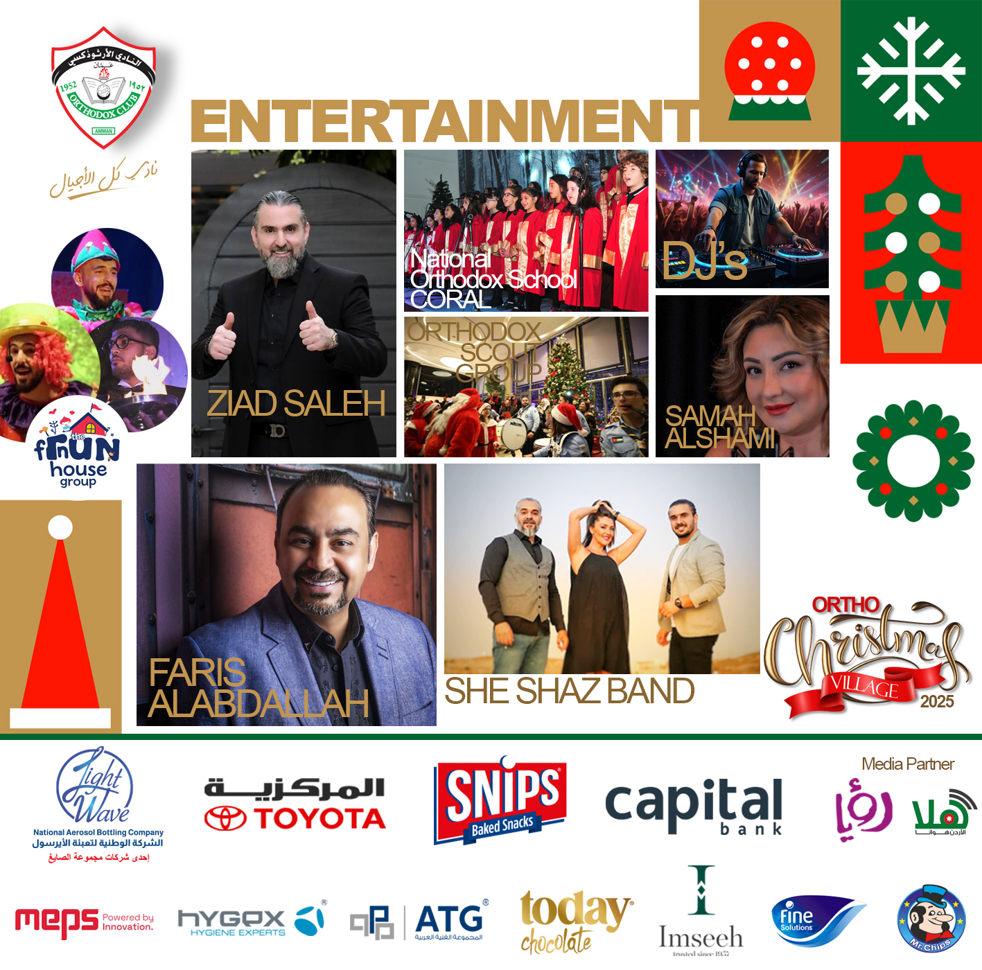 Experience the Magic of Christmas at Ortho Christmas Village! Join us for a joyful and festive three-day celebration at The Orthodox Club – Abdoun Thursday, Dec 4, 2025 4:00 PM – 11:00 PM Friday, Dec 5, 2025 12:00 PM – 11:00 PM Saturday, Dec 6, 2025 4:00 PM – 11:00 PM Enjoy: - Christmas Bazaar - Delicious food & drinks - Fun activities for all ages - Kids’ zone (Sports Hall) A magical Christmas experience awaits you! Entry Fee (Adults & Kids): 3JD / Members 5JD / Non-Members Merry Christmas & Happy Holidays