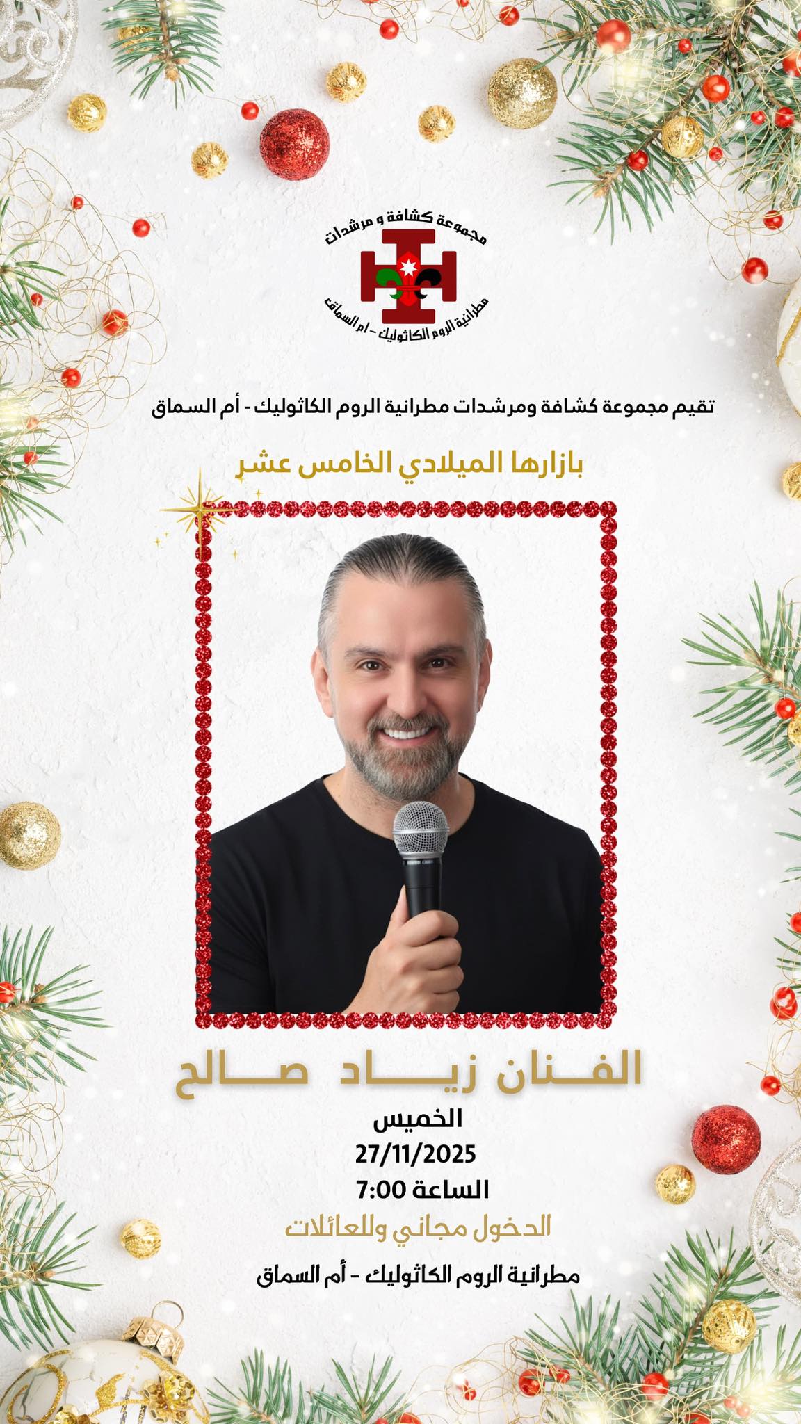 Under the patronage of Her Royal Highness Princess Sana Asim The Scouts and Guides Group of the Roman Catholic Diocese – Umm Al-Summaq is honored to invite you to attend its 15th Christmas Bazaar. Starting from: Thursday, 27/11/2025 – Opening at 6:00 PM until 10:00 PM 7:00 PM: Guest artist Ziad Saleh Friday, 28/11/2025 – 4:00 PM to 10:00 PM 6:30 PM: Guest artist Zaid Al-Abdallah 8:30 PM: Guest artist Tawfiq Al-Dallo Saturday, 29/11/2025 – 4:00 PM to 10:00 PM 6:30 PM: Guest singer Marsel Sweileh 7:00 PM: Guest musician Issa Al-Balleh 7:30 PM: Guest artist Tony Kattan Sunday (Last Day), 30/11/2025 – 4:00 PM to 10:00 PM 8:30 PM: Guest artist Haitham Elias And of course, the Santa Show and family activities with music from our band every day. Come in large numbers, let’s enjoy the festive atmosphere together, and have fun with our children. For inquiries and contact: Leader Saif – 0790170552 Happy Holidays! 🎄 Merry Christmas Free entry and for families