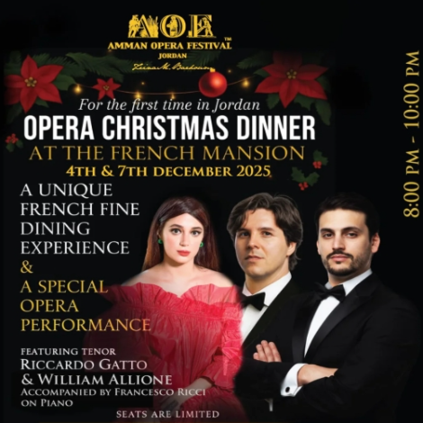 n unforgettable night where fine dining meets world-class opera in the heart of Jordan.” The French Mansion invites you to a one-of-a-kind cultural and culinary experience that blends live opera performances with a refined French fine dining menu. Guests will indulge in a multi-course gourmet dinner, candlelit ambiance, and captivating performances by renowned international and Jordanian opera artists, all within the enchanting French architecture and elegance of The Mansion. This is the first event of its kind in Jordan, offering an opportunity to experience art, culture, and gastronomy on an international level right here at home. --- 🎟️ Ticket Details VIP Class: 100 JDs (Includes a 3-course fine dining meal + welcome drink) Premium Class: 75 JDs (Includes a 2-course meal + welcome drink) Regular Class: 45 JDs (Includes a 1-course meal + welcome drink) ✨ Early Bird Offer: 10% discount available until November 20th, 2025 🥂 Special dietary meals available upon request --- 📞 Reservation Details Seats are limited and reservations are by advance booking only. You can book directly through CLIQ or by calling: 📱 0775202220 / 0779555662