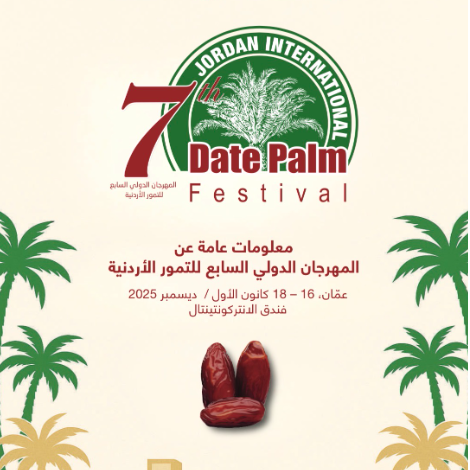 The 7th Jordan International Date Palm Festival will take place in Amman from 16–18 December 2025 at the InterContinental Hotel. Organized under the patronage of His Majesty King Abdullah II, the festival highlights the deep ties between Jordan and the UAE and aims to support the development of the date palm sector.