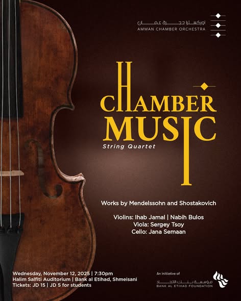 Join us for an evening of chamber music featuring works by Mendelssohn and Shostakovich, performed by members of the Amman Chamber Orchestra. Program: Felix Mendelssohn (1809-1847): String Quartet No. 6 in F minor, Op. 80 Dmitri Shostakovich (1906-1975): String Quartet No. 8 in C minor, Op. 110 Violins: Ihab Jamal | Nabih Bulos Viola - Sergey Tsoy Cello - Jana Semaan 📆November 12, 2025 | 7:30 PM 📍 Halim Salfiti Auditorium | Bank Al Etihad, Shmeisani 🎟️ Tickets: 15 JD 🎓 Students: 5 JD