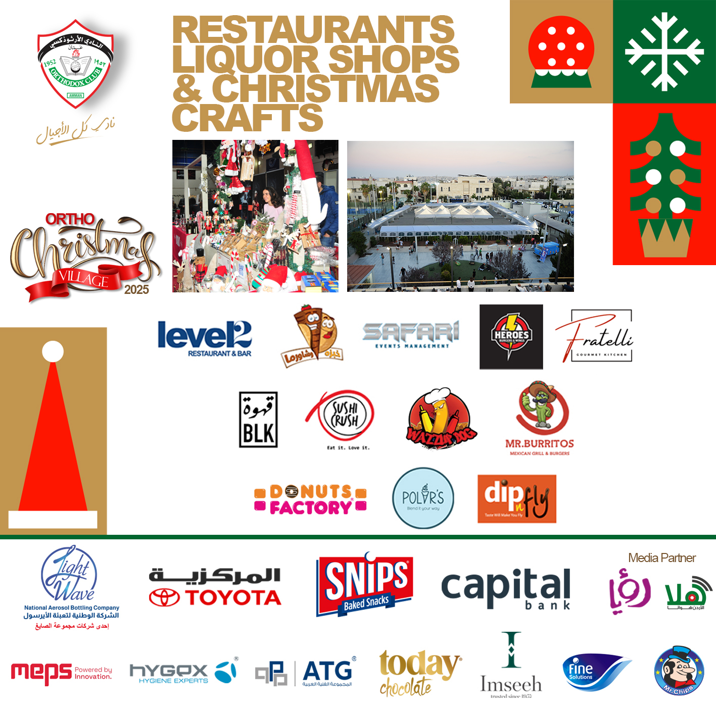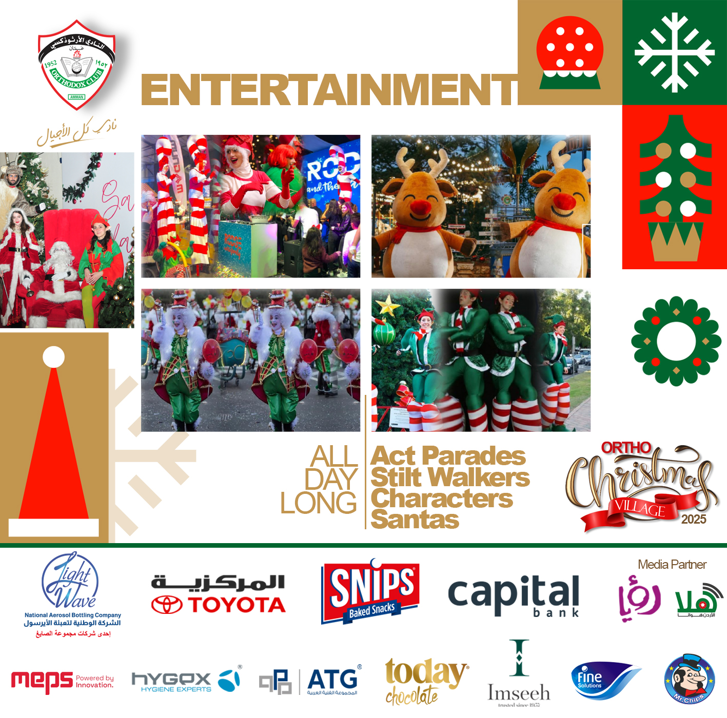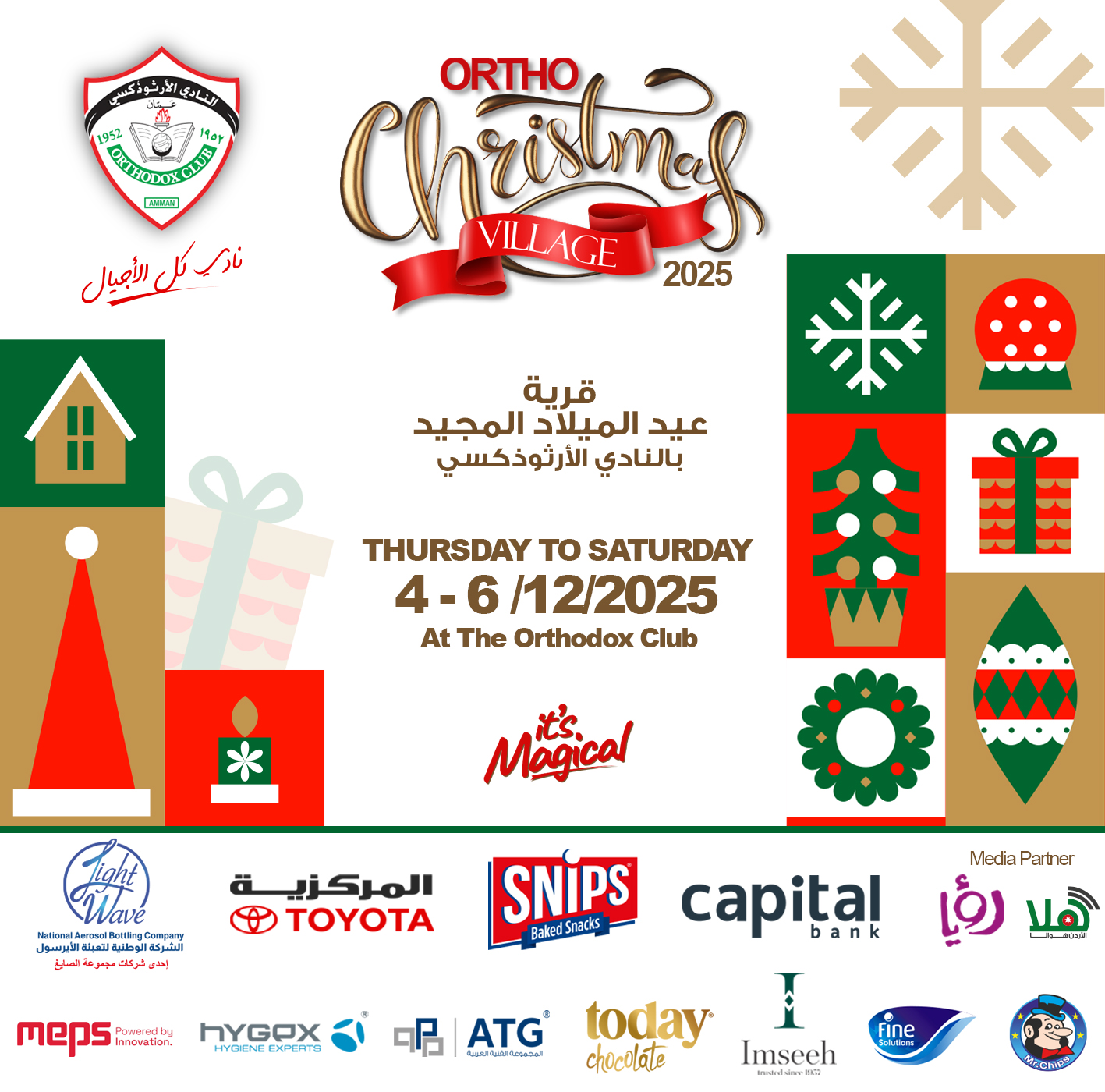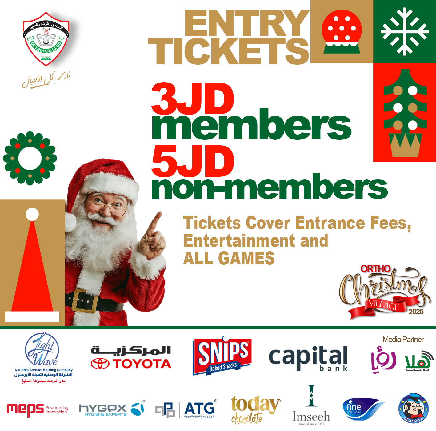 Experience the Magic of Christmas at Ortho Christmas Village! Join us for a joyful and festive three-day celebration at The Orthodox Club – Abdoun Thursday, Dec 4, 2025 4:00 PM – 11:00 PM Friday, Dec 5, 2025 12:00 PM – 11:00 PM Saturday, Dec 6, 2025 4:00 PM – 11:00 PM Enjoy: - Christmas Bazaar - Delicious food & drinks - Fun activities for all ages - Kids’ zone (Sports Hall) A magical Christmas experience awaits you! Entry Fee (Adults & Kids): 3JD / Members 5JD / Non-Members Merry Christmas & Happy Holidays