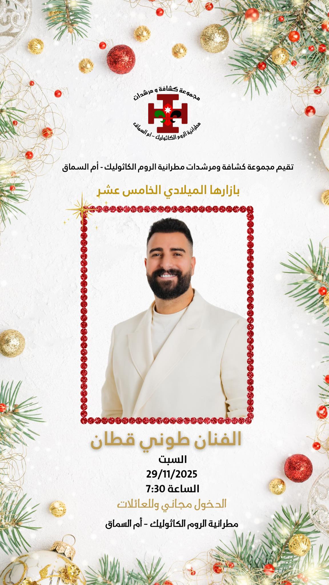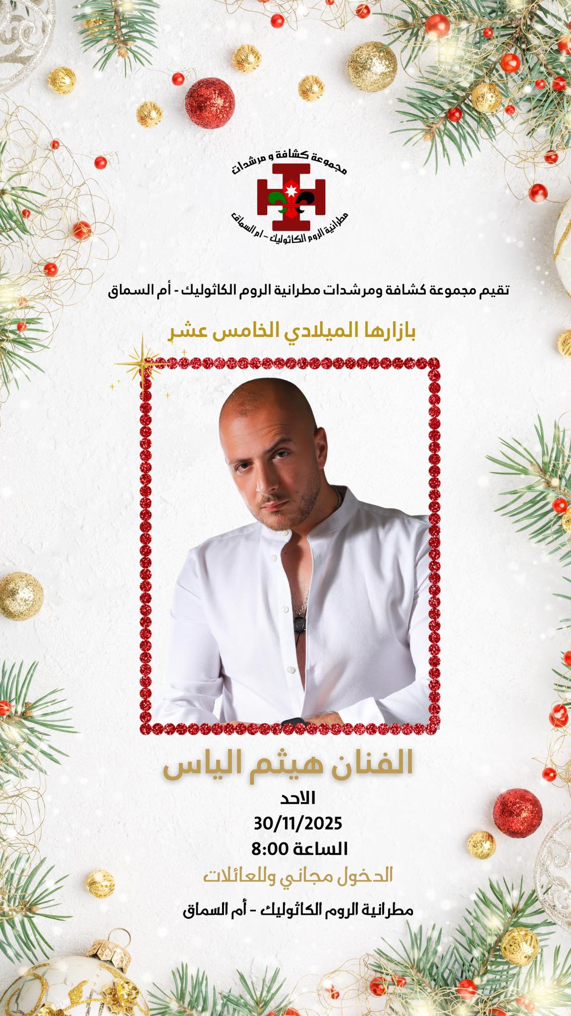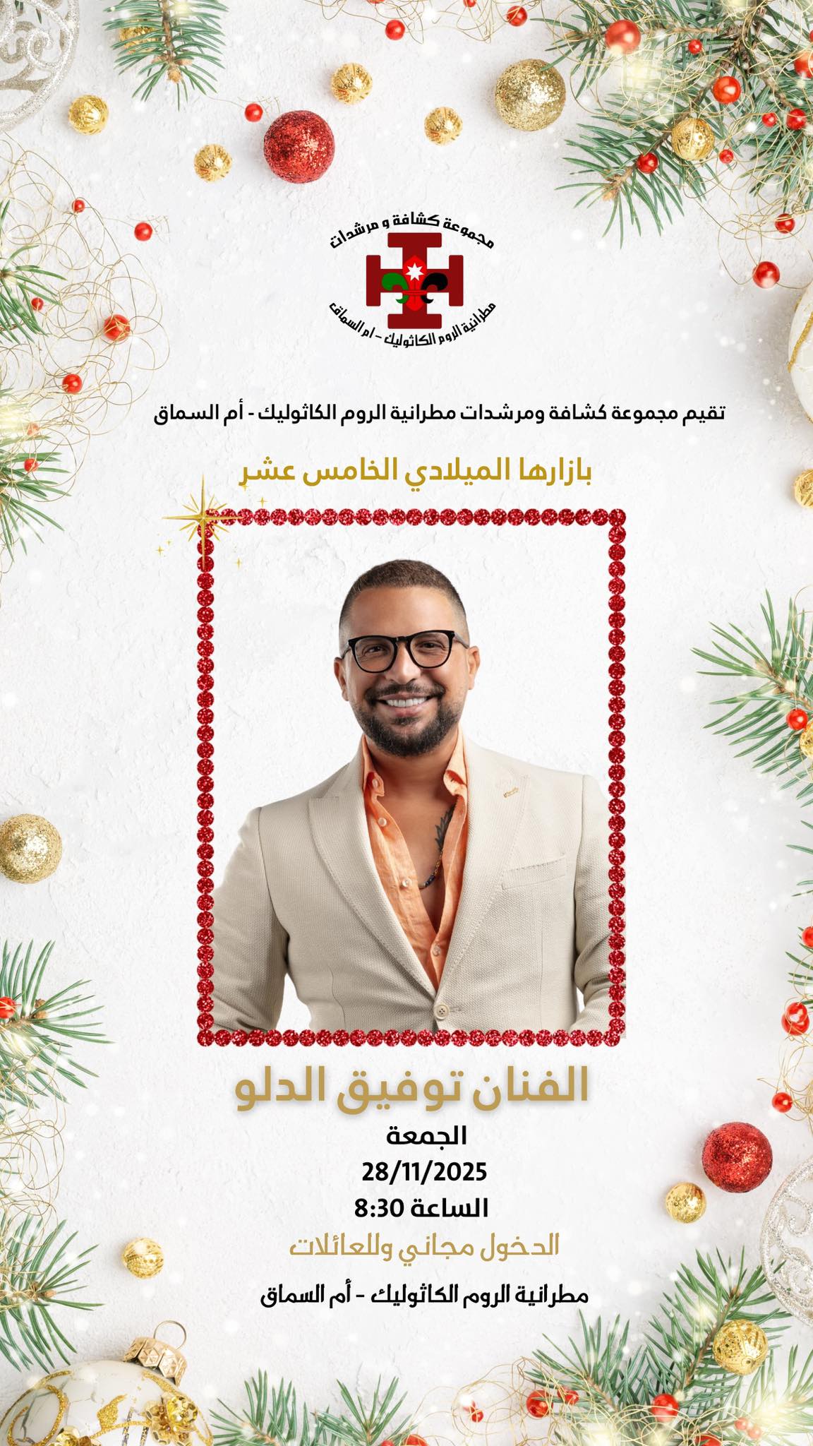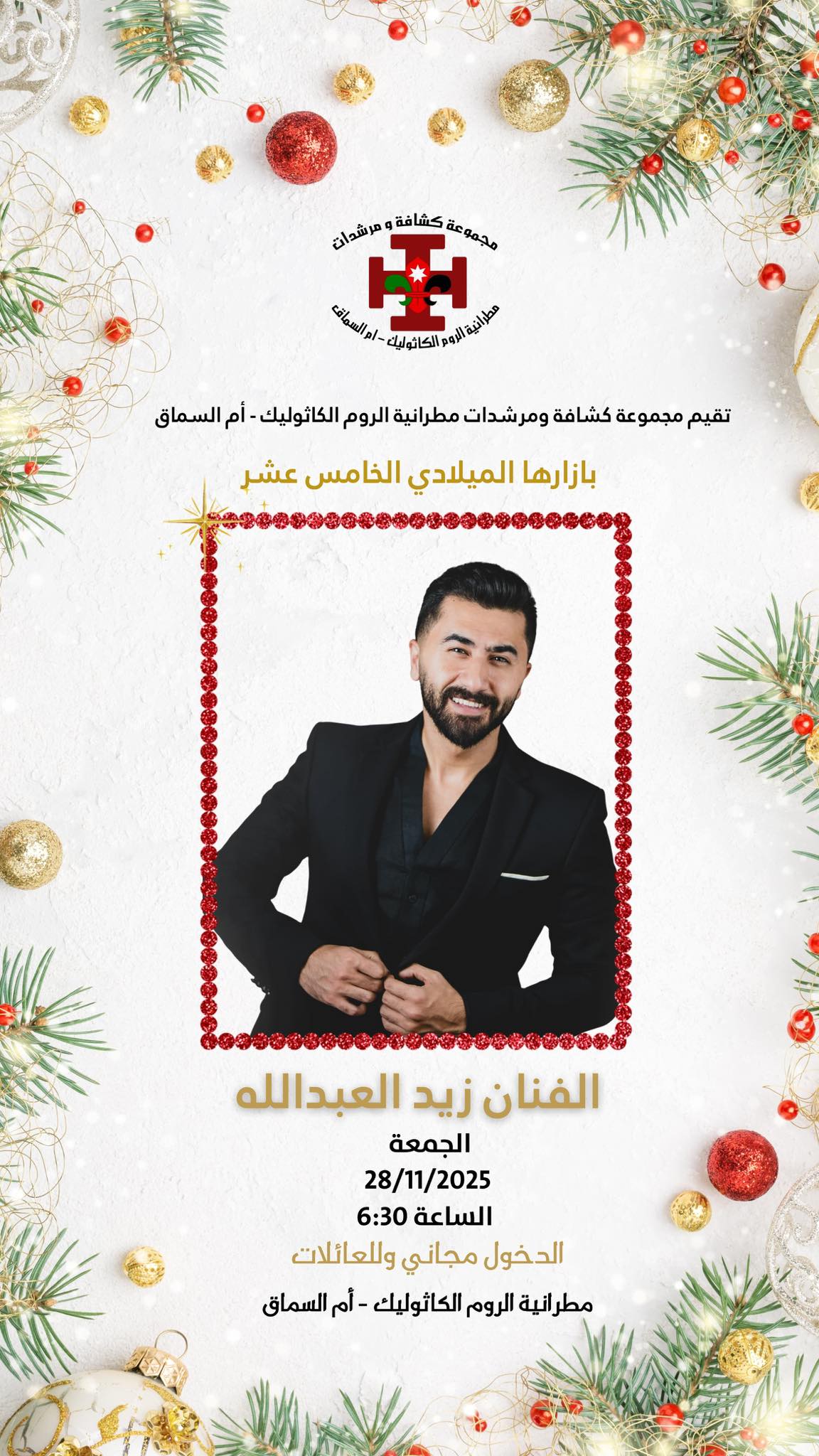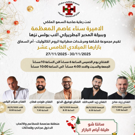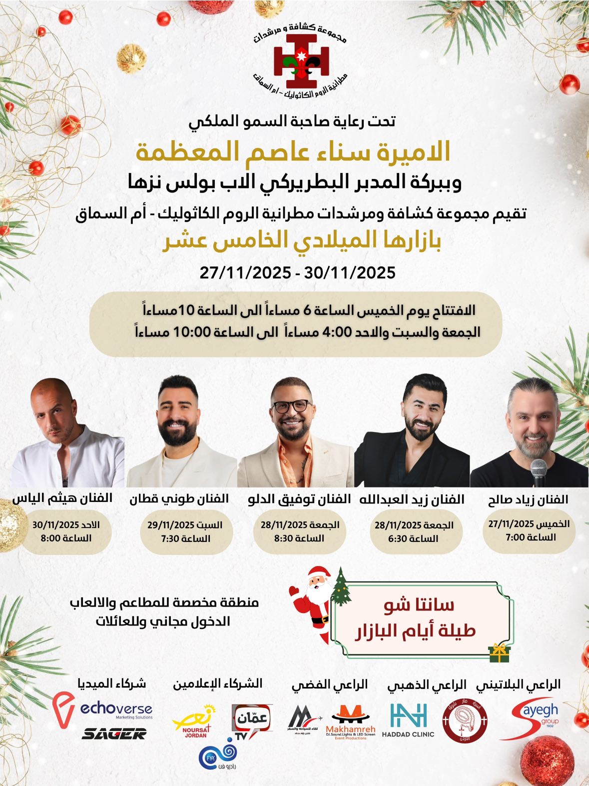 Under the patronage of Her Royal Highness Princess Sana Asim The Scouts and Guides Group of the Roman Catholic Diocese – Umm Al-Summaq is honored to invite you to attend its 15th Christmas Bazaar. Starting from: Thursday, 27/11/2025 – Opening at 6:00 PM until 10:00 PM 7:00 PM: Guest artist Ziad Saleh Friday, 28/11/2025 – 4:00 PM to 10:00 PM 6:30 PM: Guest artist Zaid Al-Abdallah 8:30 PM: Guest artist Tawfiq Al-Dallo Saturday, 29/11/2025 – 4:00 PM to 10:00 PM 6:30 PM: Guest singer Marsel Sweileh 7:00 PM: Guest musician Issa Al-Balleh 7:30 PM: Guest artist Tony Kattan Sunday (Last Day), 30/11/2025 – 4:00 PM to 10:00 PM 8:30 PM: Guest artist Haitham Elias And of course, the Santa Show and family activities with music from our band every day. Come in large numbers, let’s enjoy the festive atmosphere together, and have fun with our children. For inquiries and contact: Leader Saif – 0790170552 Happy Holidays! 🎄 Merry Christmas Free entry and for families