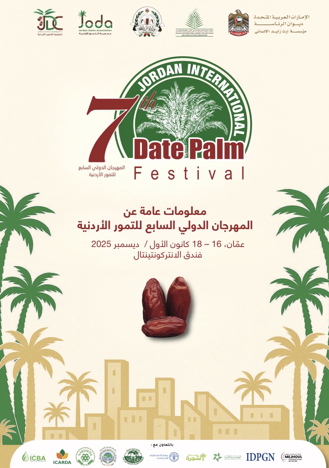 The 7th Jordan International Date Palm Festival will take place in Amman from 16–18 December 2025 at the InterContinental Hotel. Organized under the patronage of His Majesty King Abdullah II, the festival highlights the deep ties between Jordan and the UAE and aims to support the development of the date palm sector.