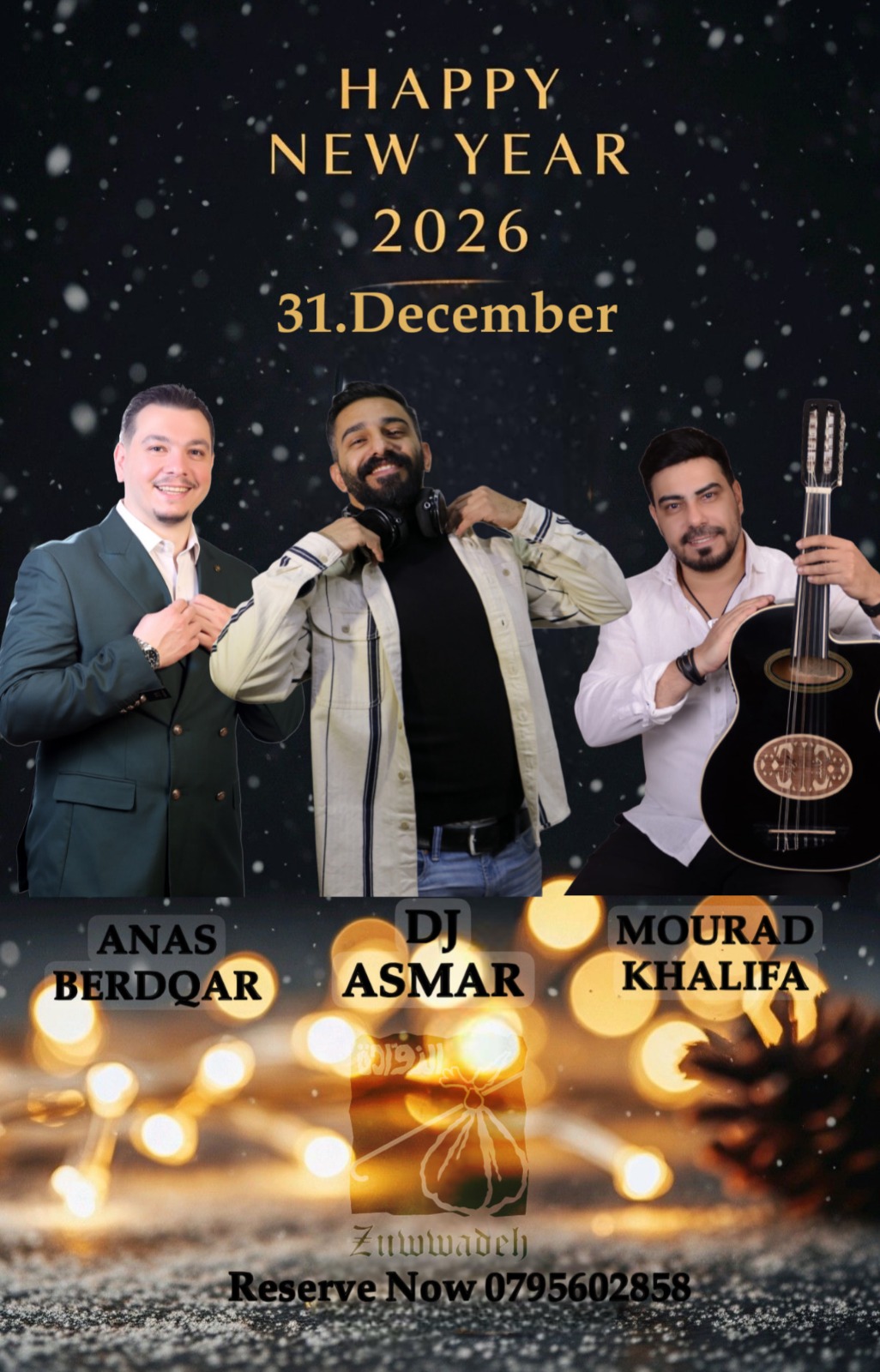 Welcome the New Year in a luxurious atmosphere with an exceptional evening featuring performances by artist Anas Bayrakdar, artist Murad Khalifa, and DJ Haitham Al-Asmar. For tickets and reservations, please call: 0795602858